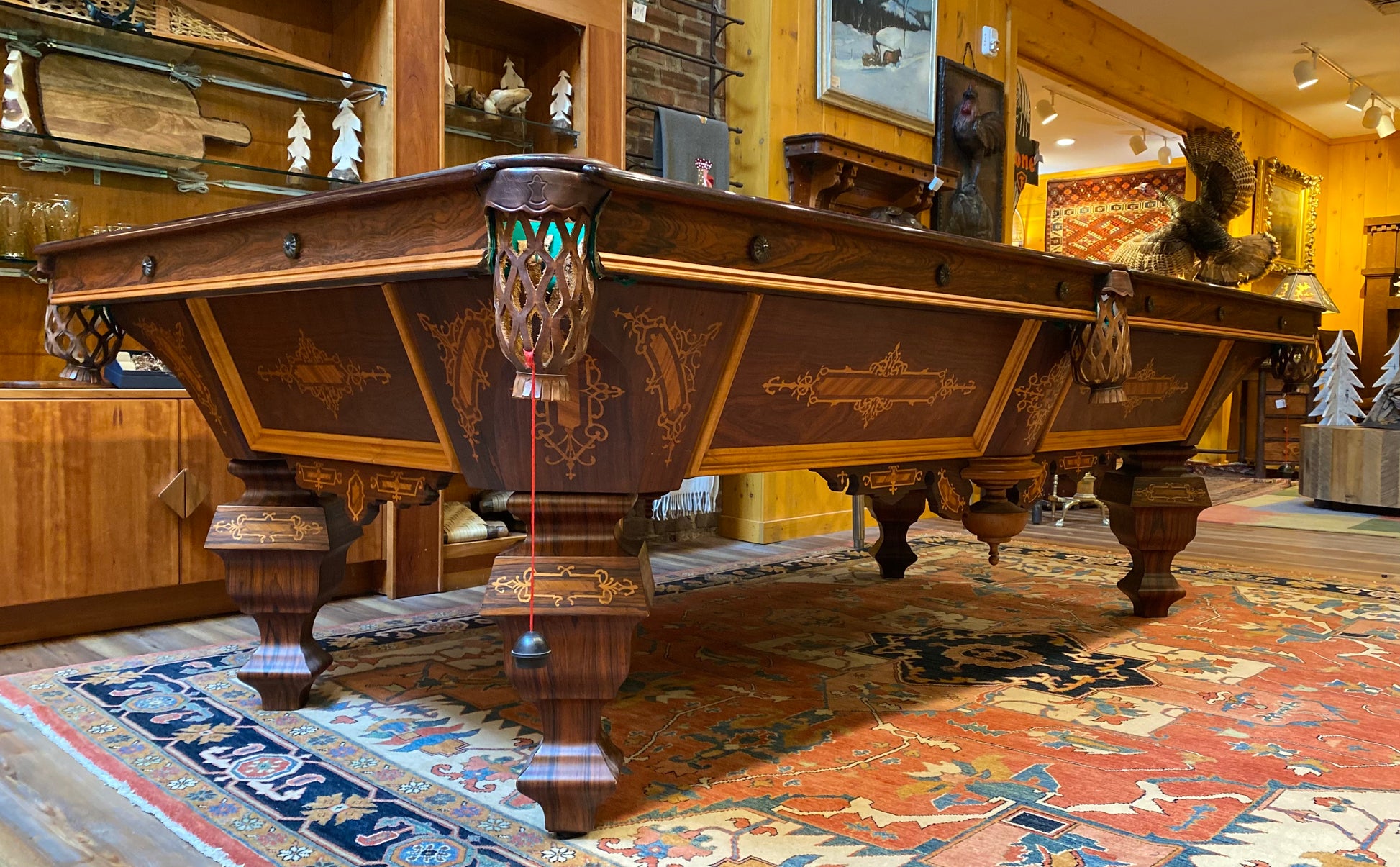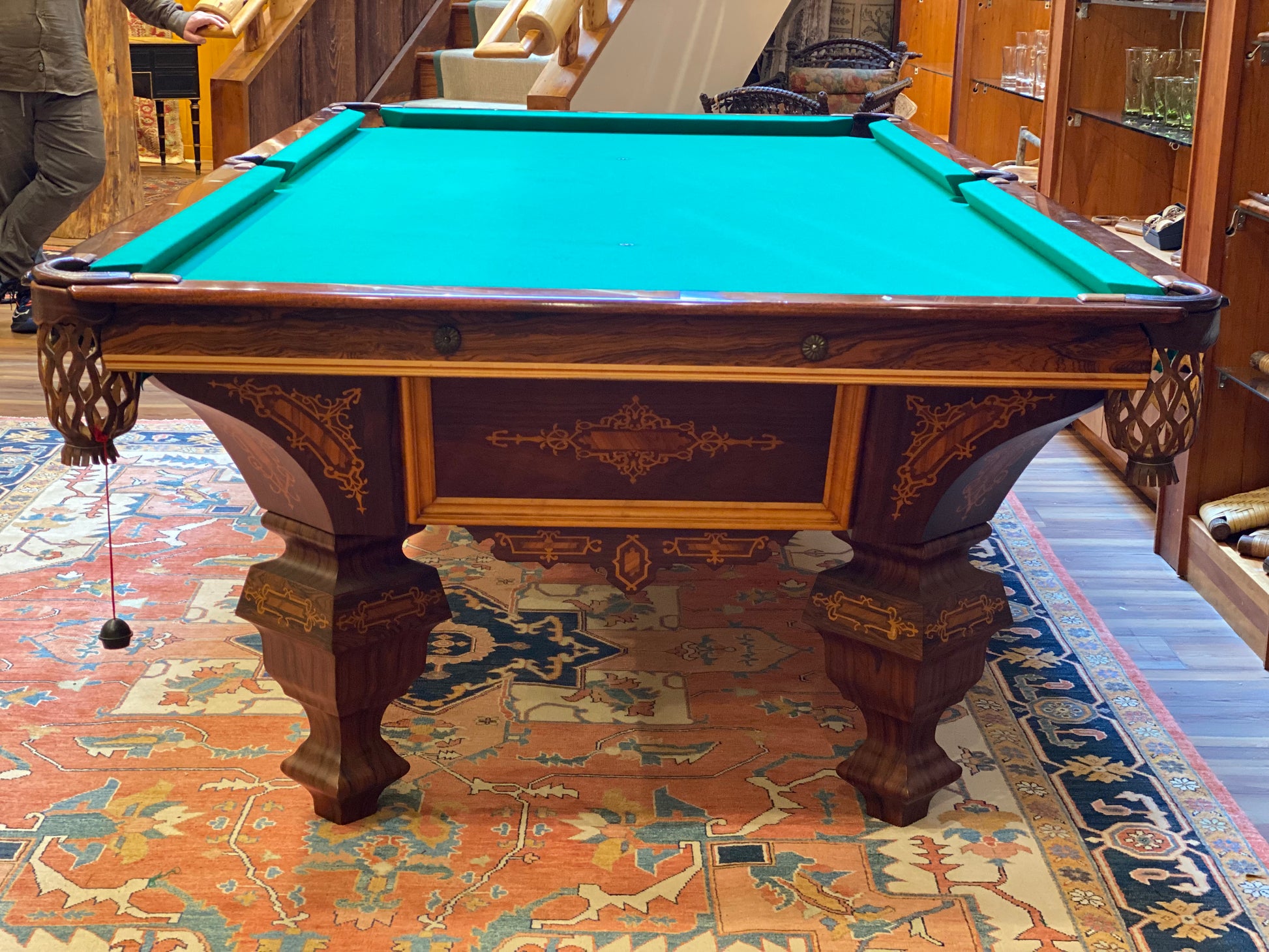 This ornate Brunswick pool table model was used for championship matches during the 1800s because of its superior playing qualities and its general excellence in construction. This 9-foot antique pool table features panels of French walnut burl and extensive hand inlays of exotic woods. Fancy inlaid scrollwork and turnings accent the lower edges of the cabinet.