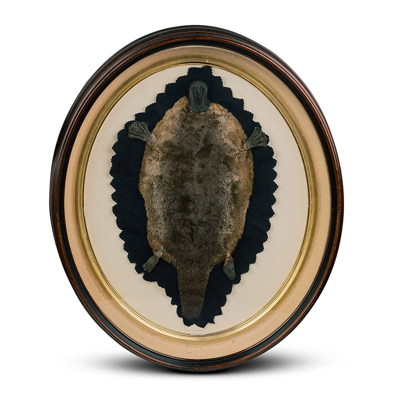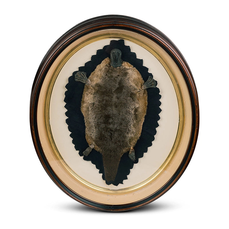 Highly unusual and rare Antique Victorian Platypus Rug on felt in an oval frame. Circa 1900.